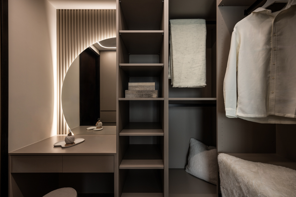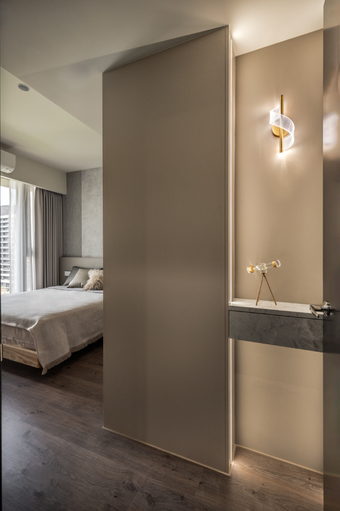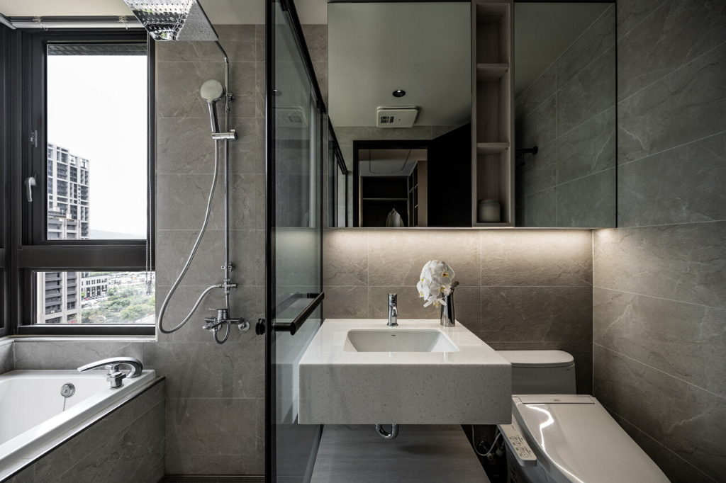 沈宏杰總監還利用系統櫃隔出更衣室,同時在櫃體背面精密節省出15公分區域,以此打造一處精巧端景,好滿足屋主期待。主臥與更衣室天花均埋設矽膠軟燈條,勾勒出優美弧形,與化妝鏡的圓弧相呼應,共同構築溫潤曲面空間,避免直角帶來的壓迫感,讓休憩場域韻味深邃又不失溫度。至於主臥浴室採用乾濕分離設計,打造出五星級飯店般的精緻體驗。灰色調磁磚鋪陳靜謐氣息,玻璃隔間的運用讓空間通透明亮。洗手台面選用純白色調,與灰色牆面形成對比,化妝鏡下方的照明設計則增添溫暖質感。