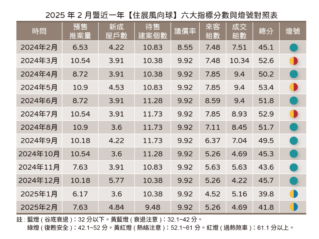 2025年2月暨近一年【住展風向球】六大指標分數與燈號對照表