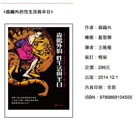 森鷗外在台灣書市的中文譯本並不多,這部小說集同時收錄了〈性慾的生活〉與〈半日〉兩篇具有自傳性色彩的小說。![]()