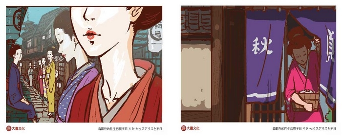 那時我身後的和式紙門被打開,有一個女人走進來,站在方形紙罩座燈的旁邊。就如同在劇院中看過的妓女一樣,繫著大大的髮髻、頭上插著大大的簪子,腳邊拖著大紅色的的裙子下擺,腰部是以不同布料所製作的。她的五官秀麗,白皙的臉龐看起來小巧可愛。剛才那位三十歲左右的女人也跟著進來整理坐墊,隨即就坐了下來。然後沉默地微笑注視著我,而我也沉默地以嚴肅的表情回視她。