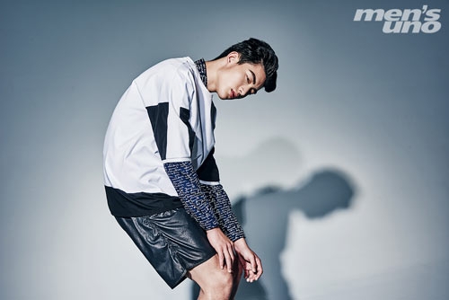 黑白色塊五分袖T恤 by Calvin Klein platinum;深藍色書寫文字襯衫 by Dior Homme;深藍皮質短褲 by Bottega Veneta