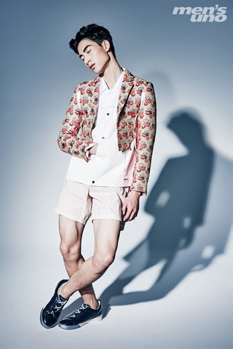 刺繡圖紋短版西裝外套by Walter Van Beirendonck from Gem;白色夾克 by Shiatzy Chen;粉色短褲 by Bottega Veneta;深藍色皮革休閒鞋 by Ermenegildo Zegna Couture