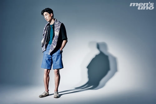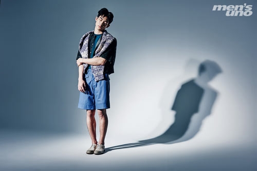 墨綠色麂皮襯衫式夾克 by Ermenegildo Zegna Couture;藍黑色不規則線條上衣 by Calvin Klein platinum;淺藍色小羊皮短褲 by Shiatzy Chen;混藍色針織衫、小牛皮繫帶鞋 by Bottega Veneta