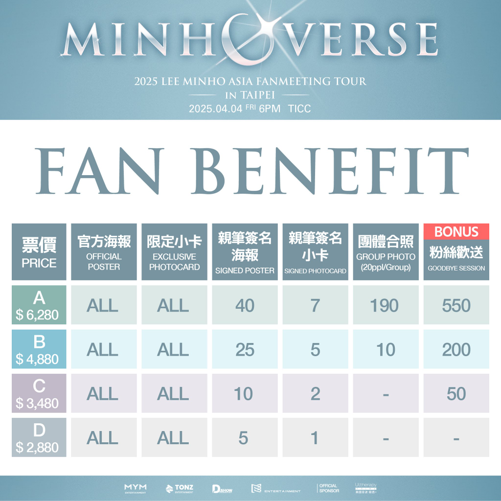 李敏鎬台北站粉絲見面會門票現於ibon官方網站公開發售,票價分別為台幣 $6,280 / $4,880 / $3,480 及 $2,880 。購買門票的粉絲,將可以獲得親筆簽名海報、 親筆簽名小卡、限定小卡及官方海報等福利的抽獎機會, 購買$6,280 / $4,880 / $3,480門票的粉絲更可獲得粉絲歡送的抽獎機會,購買$6,280 / $4,880門票的粉絲更可獲得團體合照(20人一組)的抽獎機會。