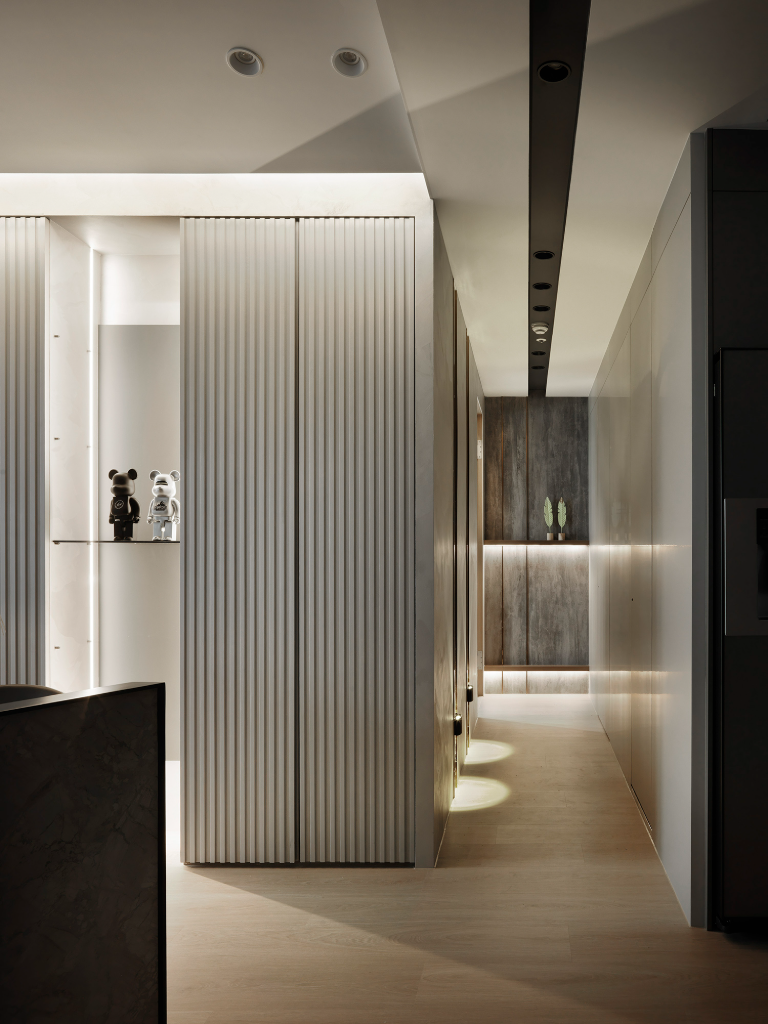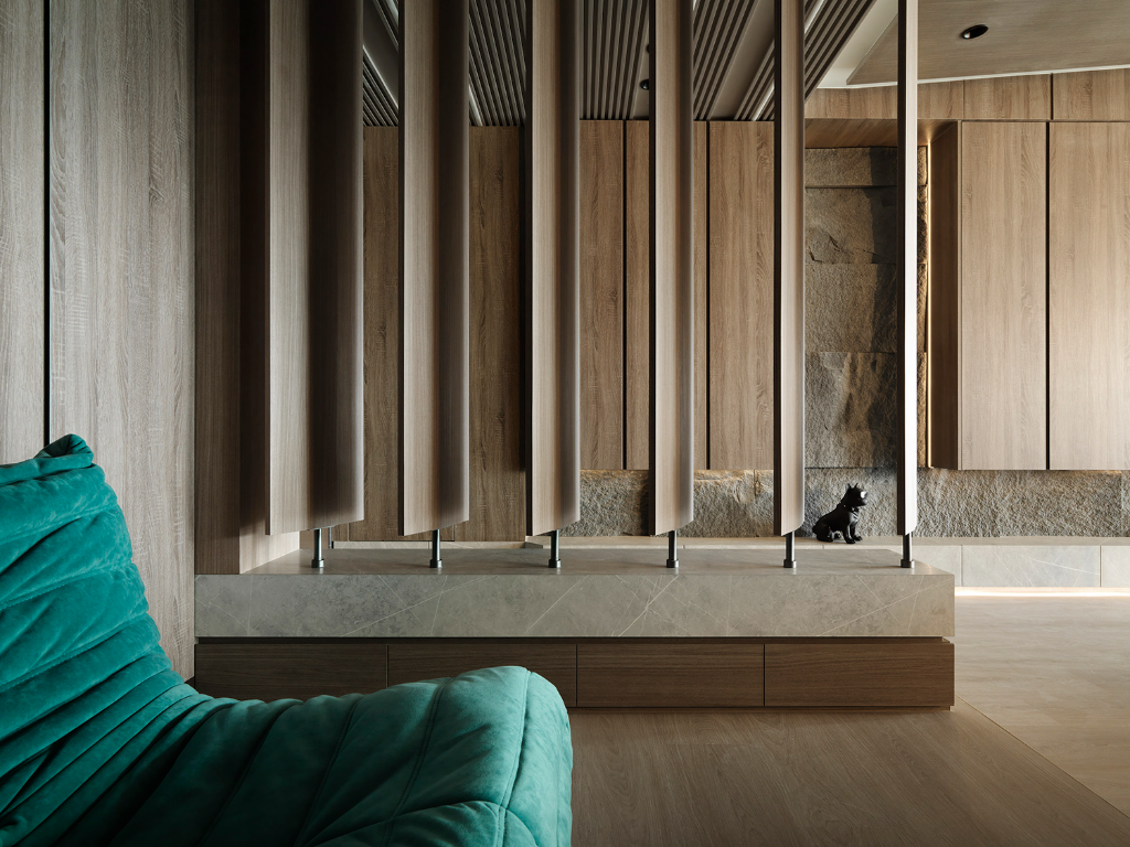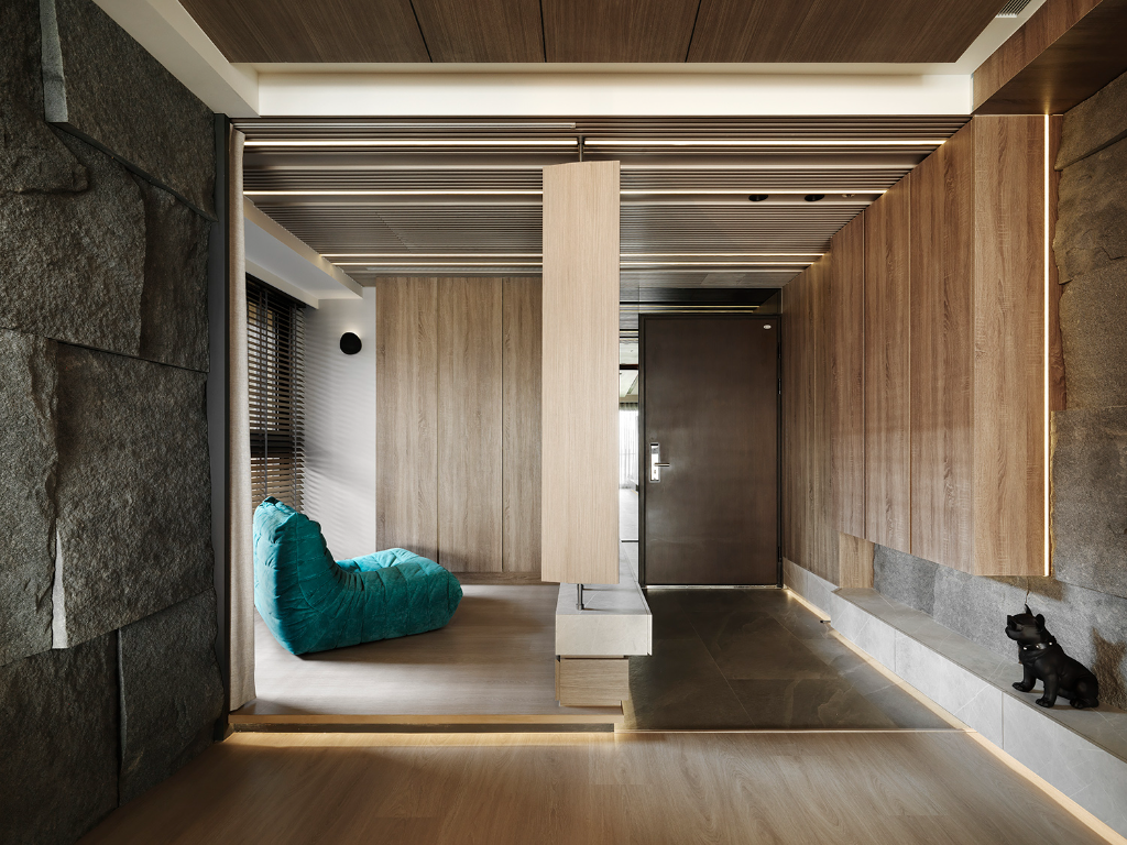 從玄關步入,映入眼簾的是錯落有致的木質排序,搭配著公領域明亮的採光鋪陳,延伸出充滿溫潤質感的開放視野。右側一片片排列整齊的木質隔板屏風,巧妙地區隔了玄關與多功能室的界線,半開放式設計不僅適度遮擋視線,更讓自然光線得以穿透,消弭了一般玄關常見的局促與陰暗。
