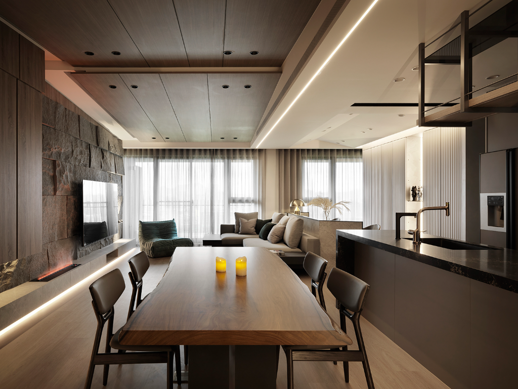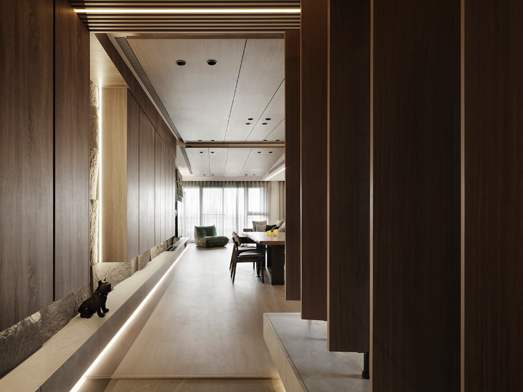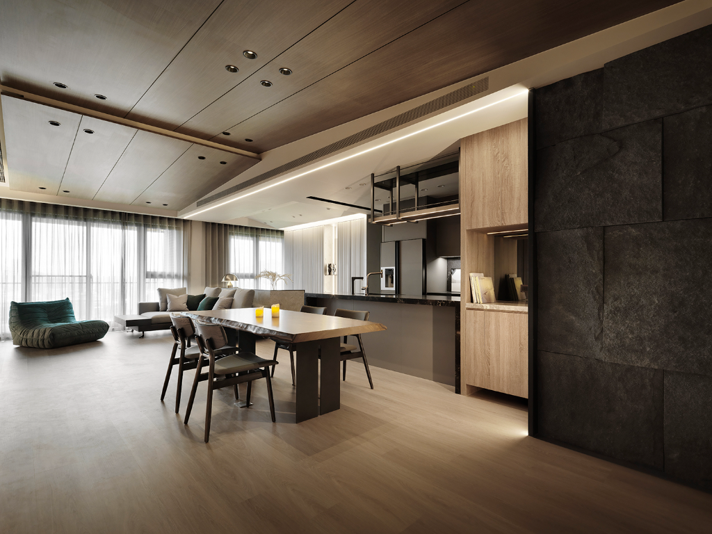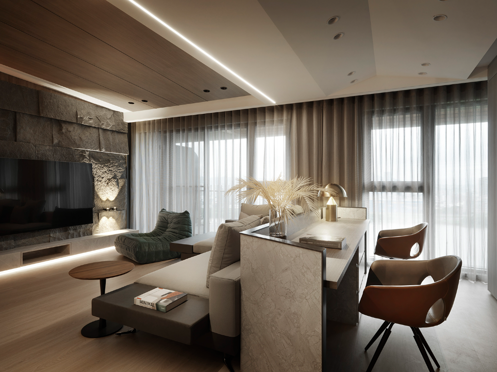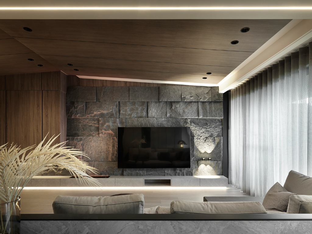 其中最引人注目的是電視牆面的設計,以天然石皮鋪陳出粗獷大氣的視覺張力,立體的自然凹凸面在燈光映照下展現出動人的光影變化。木紋櫃體從此處一路延伸至玄關,剛柔並濟地展現出大自然的質樸之美。懸空的淺色仿石紋基座搭配隱藏式燈帶,不僅淡化了天然石皮的厚重感,更為空間注入了漂浮的輕盈質感。