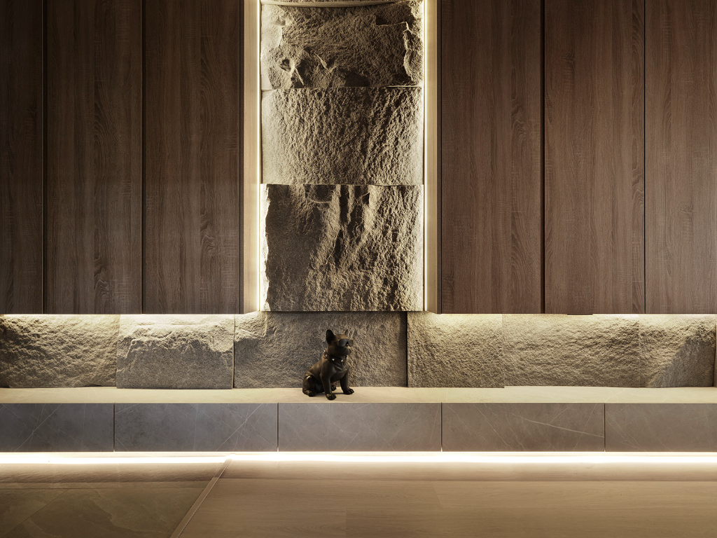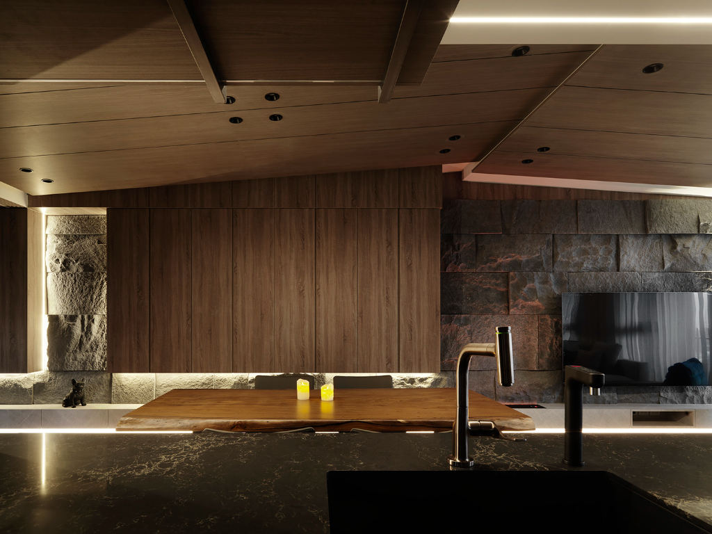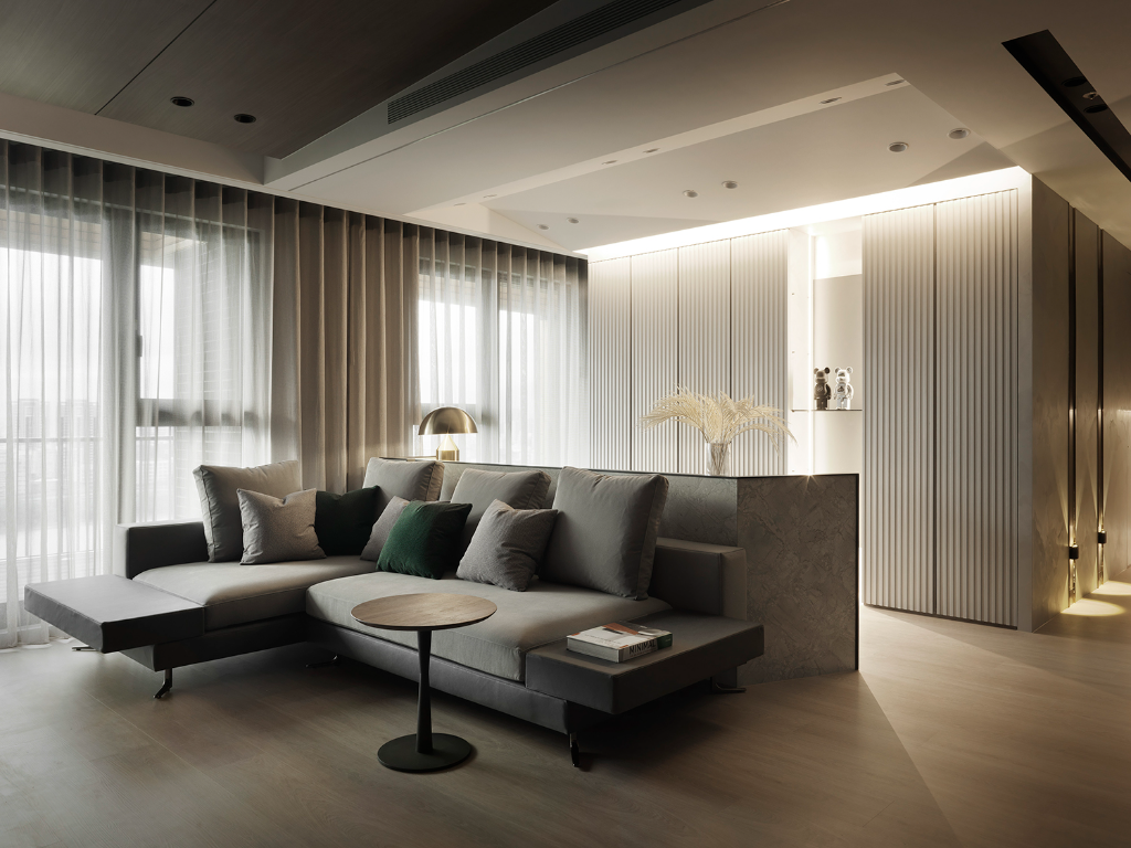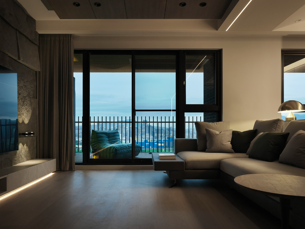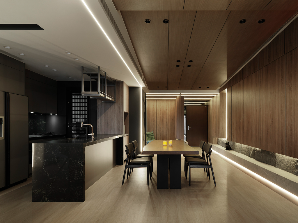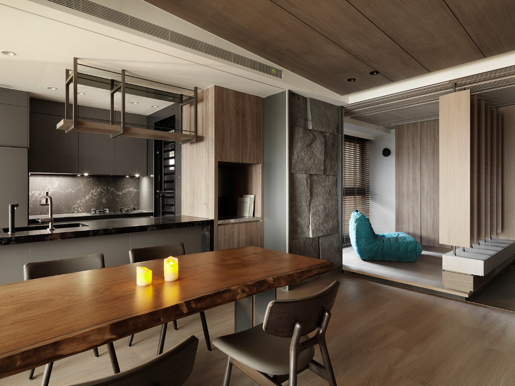 其中最引人注目的是電視牆面的設計,以天然石皮鋪陳出粗獷大氣的視覺張力,立體的自然凹凸面在燈光映照下展現出動人的光影變化。木紋櫃體從此處一路延伸至玄關,剛柔並濟地展現出大自然的質樸之美。懸空的淺色仿石紋基座搭配隱藏式燈帶,不僅淡化了天然石皮的厚重感,更為空間注入了漂浮的輕盈質感。