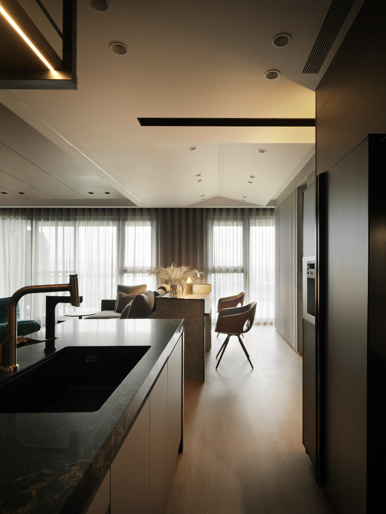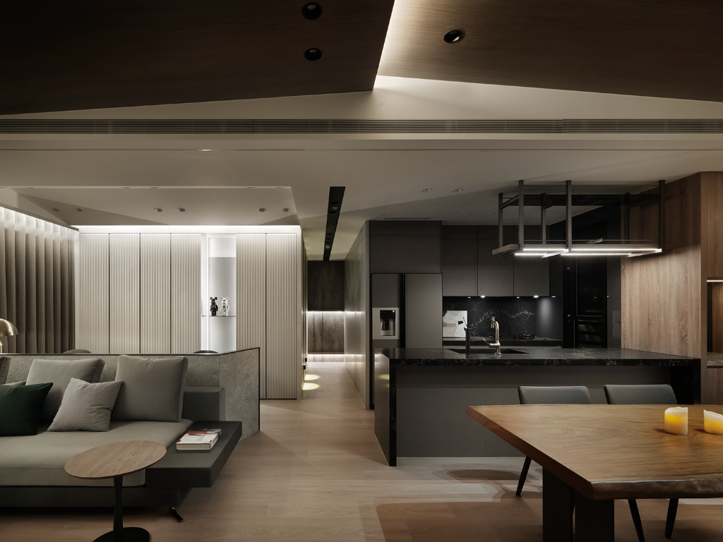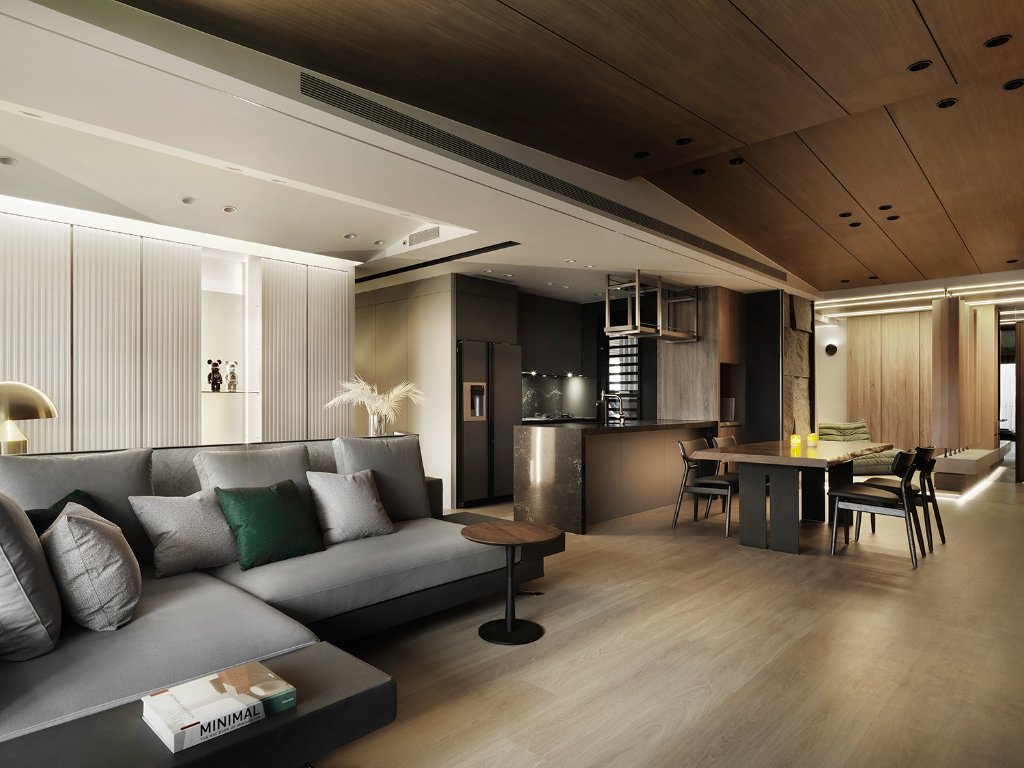 來到公共區域,設計師同樣運用開放手法打造出流暢的生活場域。濃厚的灰階與輕淺的白色以中性木質為媒介,創造出豐富的層次變化。從餐廳、廚房、客廳到沙發後方的開放式書房,每個區域都擁有獨立的機能,卻又和諧共存於同一個大空間之中。