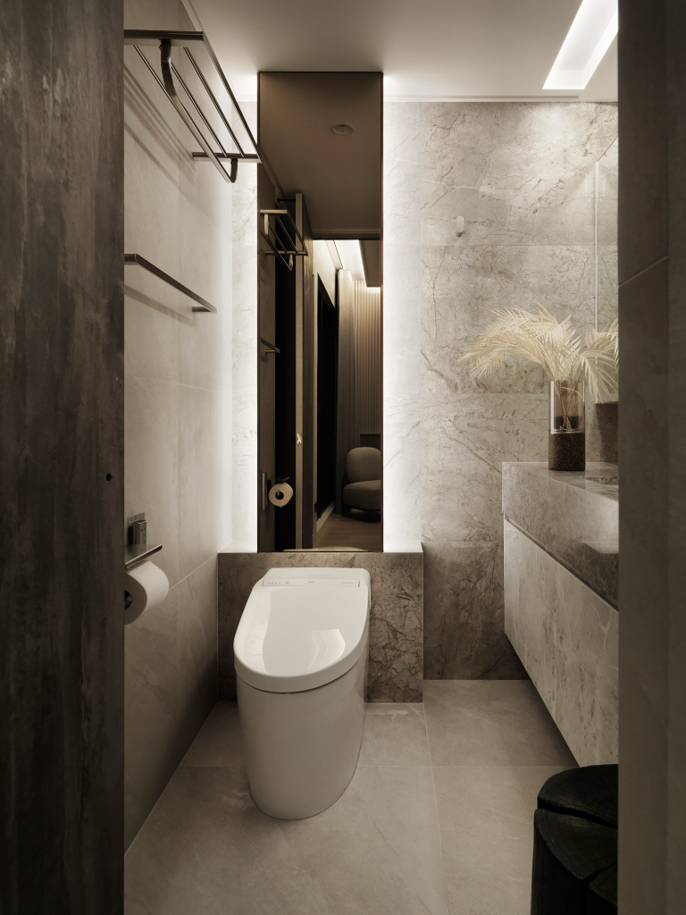 除了室內空間,設計團隊也充分運用觀景陽台與後陽台的優勢,讓整體環境擁有更豐富的生活層次。主臥、衣帽間、主浴、次臥、客浴等私密空間的規劃,則延續公領域的設計語彙,展現出前後一致的精緻質感。