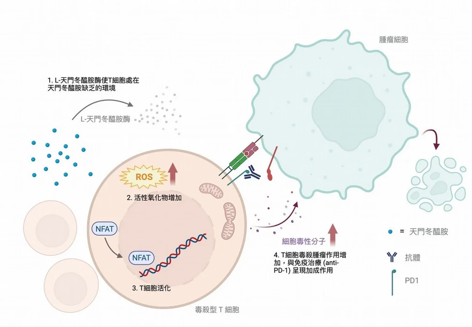 楊皇煜進一步解釋其機轉作用,目前醫界已知惡性腫瘤細胞的代謝特性,會為了維持生長與增殖,極力爭奪周邊組織的養分,進一步影響周圍免疫細胞的活性,「為了對抗癌細胞,免疫細胞具備代謝適應能力,而剝奪天門冬醯胺,能夠誘導T細胞適應代謝壓力,激發並提升粒線體活性與細胞毒性分子的反應能力,增強其抗腫瘤作用。」