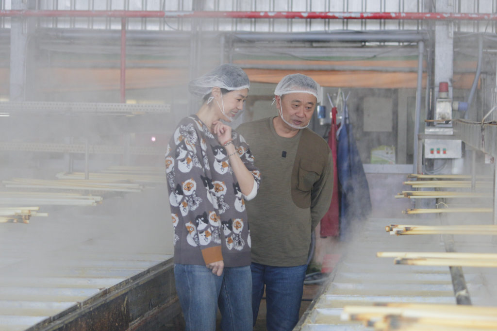 ▲ 曹雅雯(左)與邰智源(右)學習製作豆皮 。(圖:公視台語台)