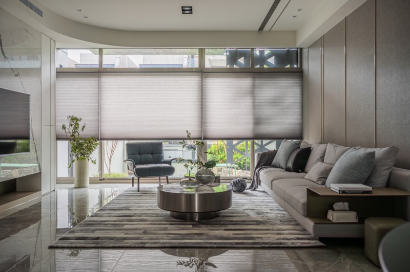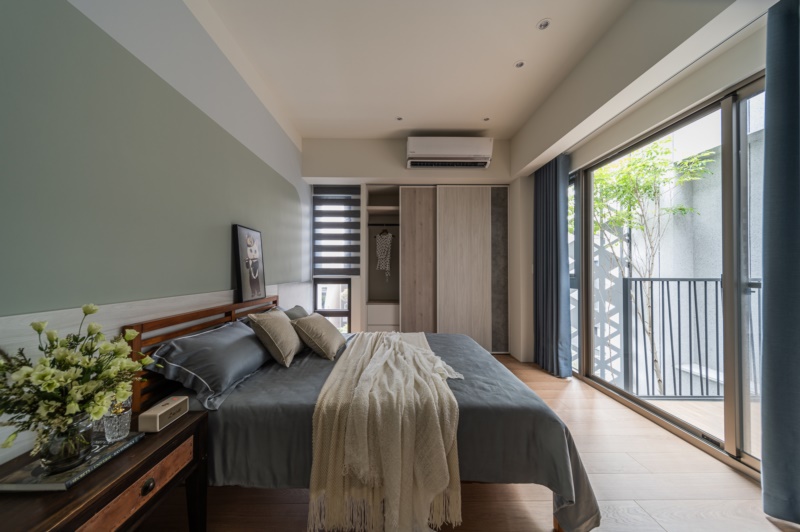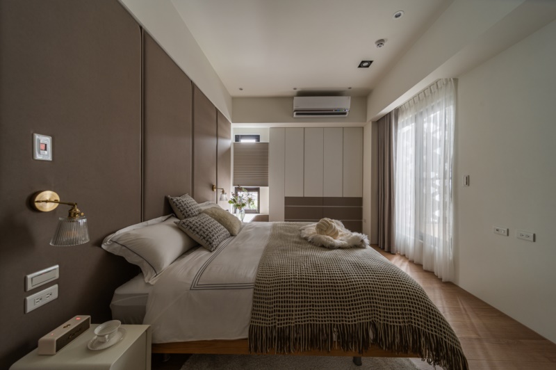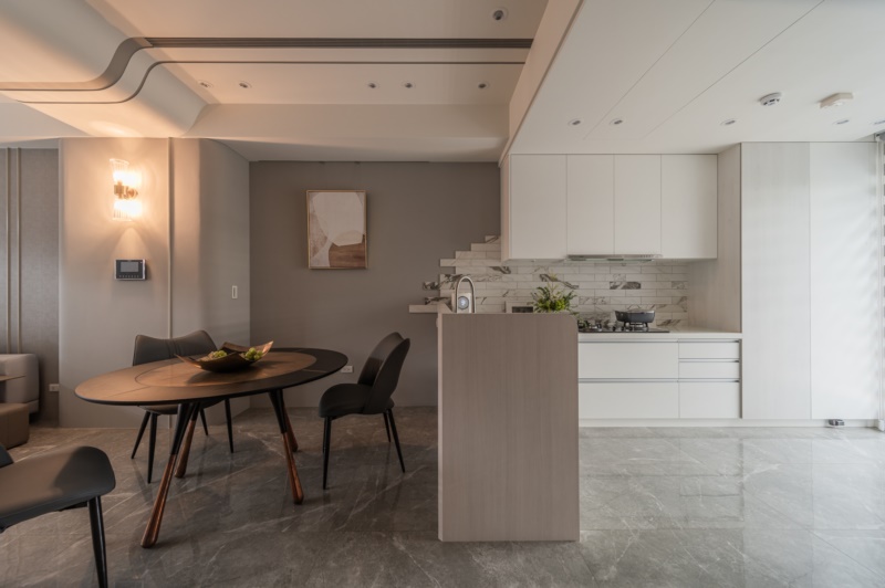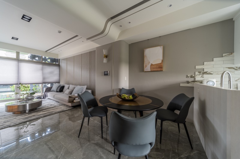 緩步移動至二樓,將客廳、餐廳、廚房規劃在同一軸線上,並以開放式的設計整合機能空間,創造空間的流動感。並採用弧形設計包覆樑柱,讓空間顯得較為柔和、舒適。其中,廚房以大理石紋磁磚交錯鋪貼於牆面,藉此劃分出區域性的同時,也能創造豐富的視覺層次。拾級而上,通往至私領域,設計師依循不同居者的喜好,分別以大地色系和莫蘭迪藍、綠色調作為三樓和四樓的臥室基底,以此打造出專屬的個性化空間。其中,不變的是利用大面開窗引進自然光的設計,皆是為了給予居者舒適安穩的休憩體驗。