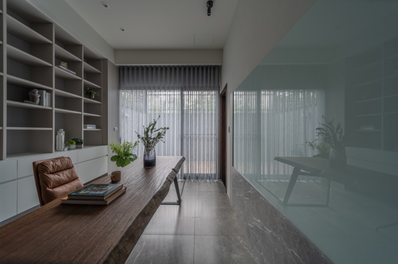 本案住宅為五層樓別墅,設計師主要規劃1至4樓,分別將1、2樓設定為公共空間,3、4樓為私人休憩空間。透過設計師的精心擘劃,不僅將業主的喜好、生活習慣和機能需求導入住所,還利用空間佈景為家挹注情感溫度,從而形塑出舒適無壓、便利的生活場景。其中,為了讓自然光景能毫無阻礙地流淌於室,除了原先的開窗設定之外,設計師還採用了開放式的格局規劃與玻璃屏風的設計,以此維持空間的敞亮感,給予居者張弛有度的空間體驗。