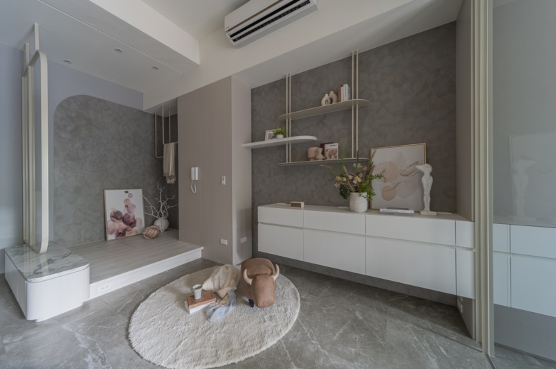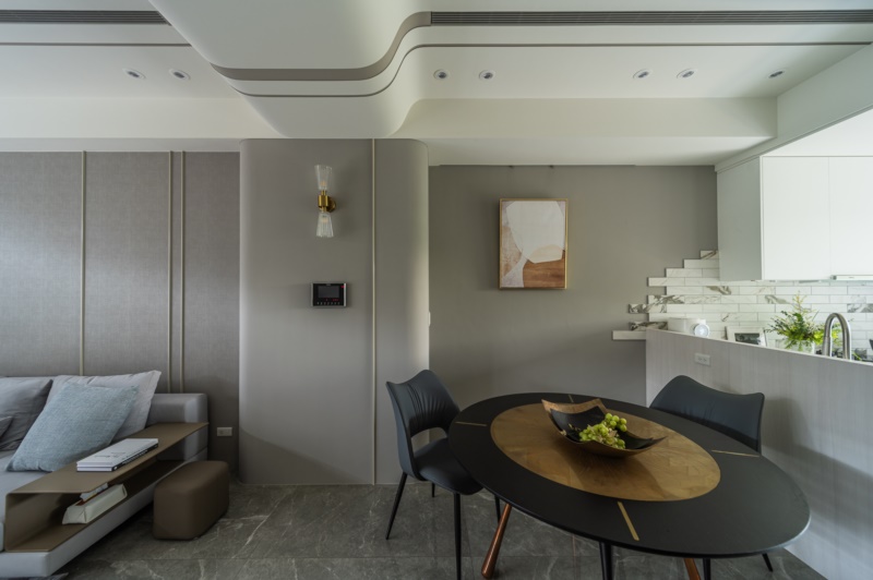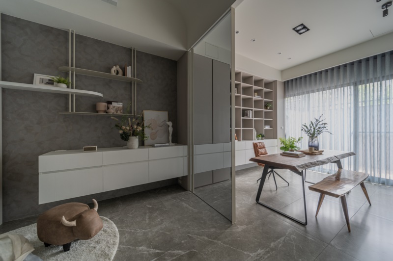 整體以現代風格手法為主,再結合質樸典雅的傢俱配置,為家烘托出雅致之韻。步入一樓空間,因應業主的職務需求,特地規劃了一區美甲美容工作室,並於其中配置了多個置物區與商品展示架,以此提供工作所需的儲物空間。同時,裝設烤漆玻璃白板於工作室中,讓業主得以隨時紀錄工作排程與靈感。
