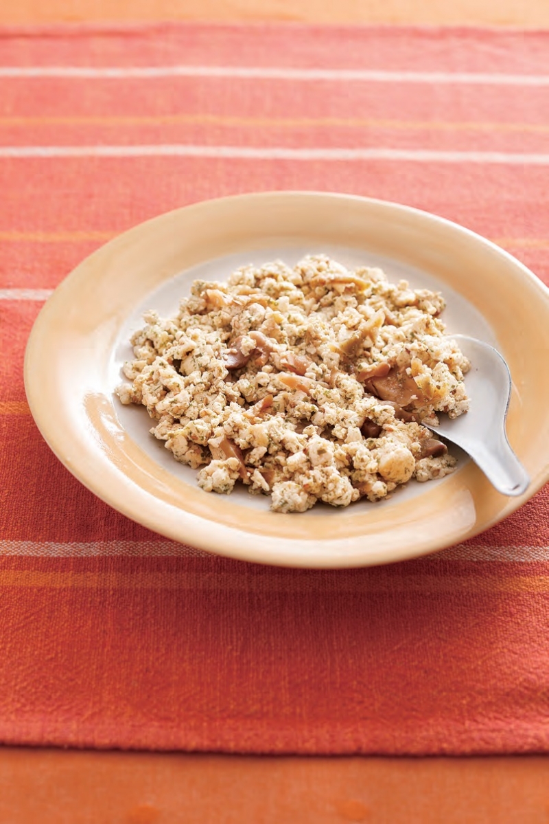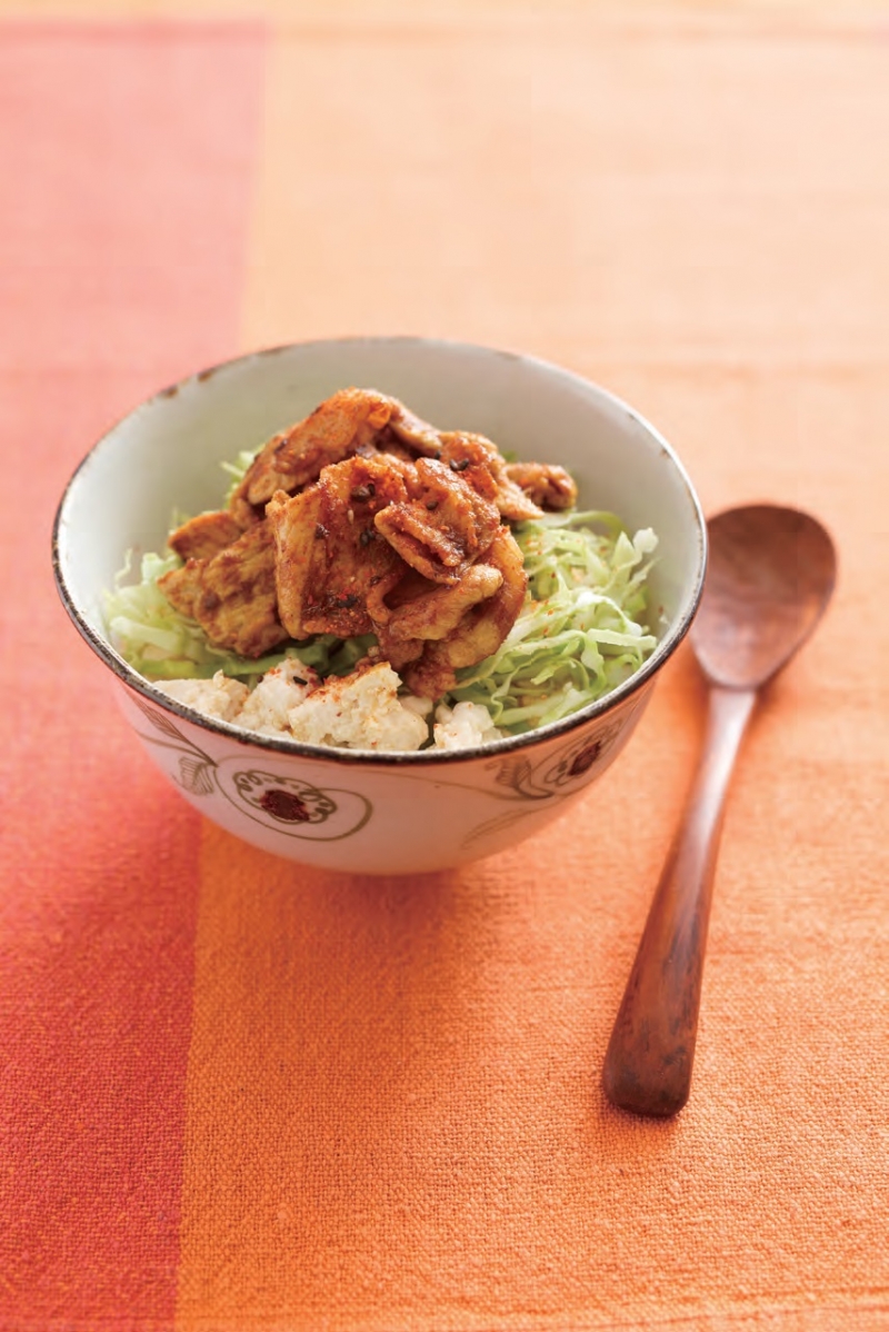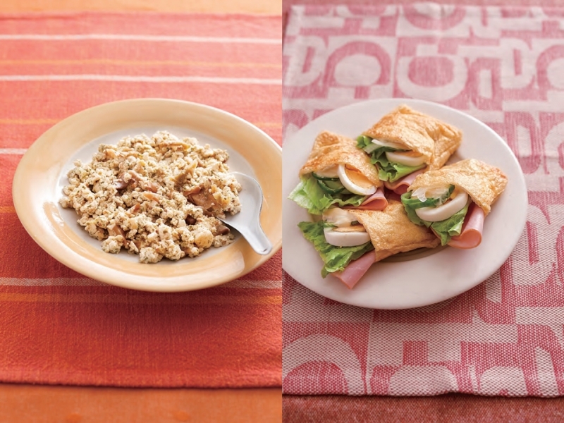將完全去除水分的豆腐搗碎取代白飯。豆腐的平淡味道與配菜的鹽味非常搭。喜歡食物有口感的人適合「板豆腐」;至於喜歡滑嫩口感的人,可以選擇適合作成類似茶泡飯或粥料理的「嫩豆腐」。