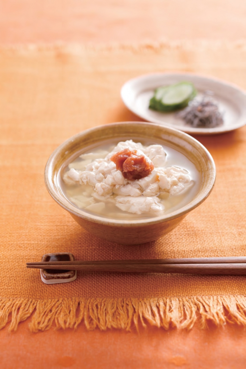 2. 將碗中多餘水分倒掉,附入茶泡飯湯粉,再淋上熱茶,最後放上梅干。除了梅干之外,也能以鹽昆布等醃漬物取代梅干使用。