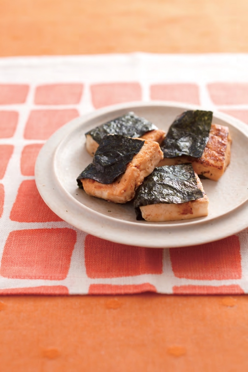 3. 將豆腐放入平底鍋排列整齊,開火。將2 的調味料放入鍋中與豆腐結合調味。豆腐兩面煎至焦香後,再以海苔捲起。