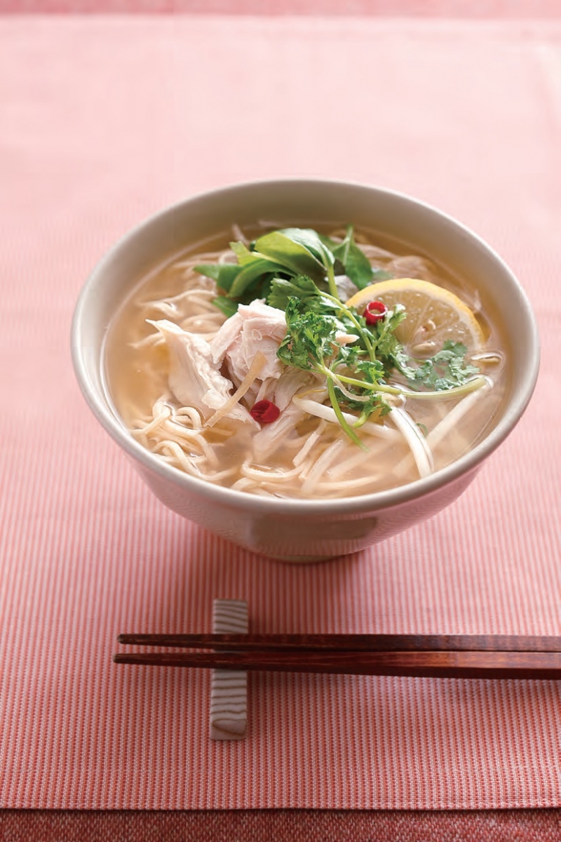 5. 將4 盛起放入大碗中,把2 撕碎的雞肉放上。薑絲、辣椒也一併放上。最後再依個人喜好酌量添上嫩青菜葉、豆芽菜、蔥花、香菜。