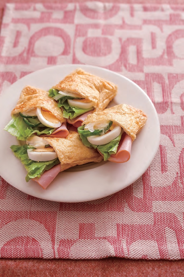 3. 最後將生萵苣、火腿、切片白煮蛋塞入油豆皮中,再將2 也加入油豆皮裡。