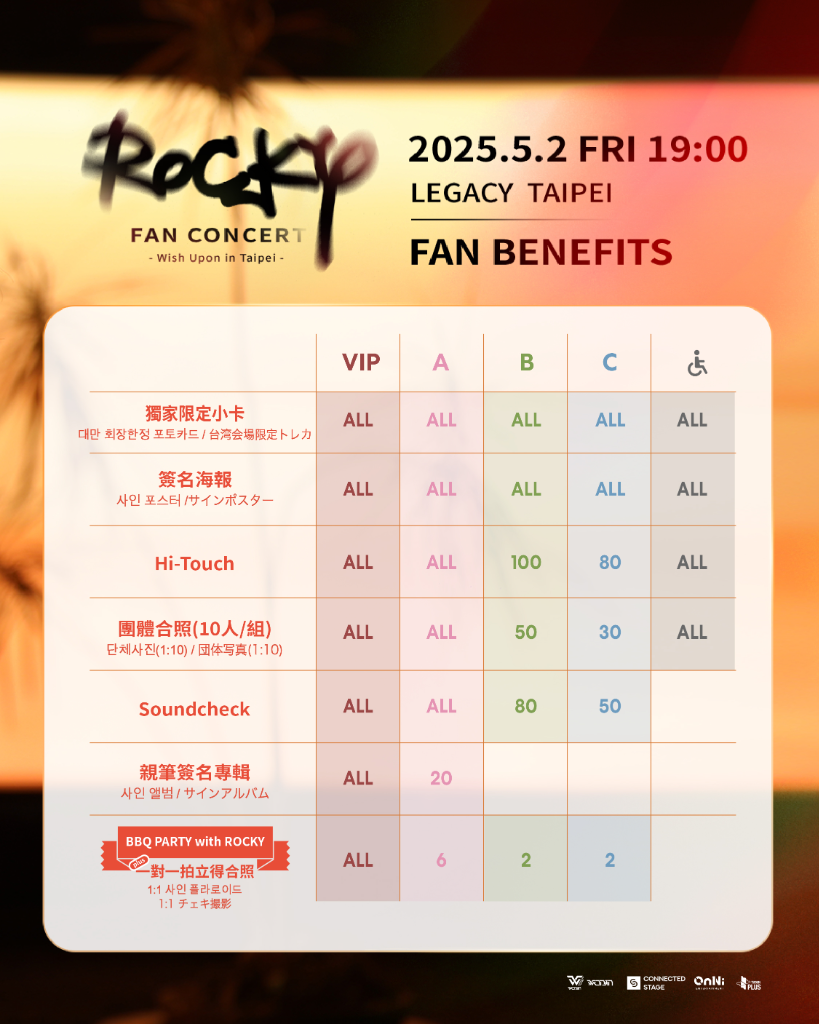 本次活動福利,ROCKY更是祭出史上最強,包括全區典藏紀念小卡、印簽海報外,還有搶先看彩排(共280人)、HI-TOUCH擊掌(共350人)、10人一組團體照(共240人)、親簽專輯(共50人),但最制霸的,莫過於創下首位韓星史無前例,不用額外再付費,全區粉絲加碼皆可抽,共40位幸運的HAMO於5/3(六),與他一起同歡吃BBQ烤肉PARTY,吃完烤肉還能跟本尊「一對一」拍立得合照,問到這項超寵福利時,ROCKY滿心期待說:「想到演唱會結束隔天,能放鬆好好跟HAMO們盡情吃烤肉,就覺得很幸福!」