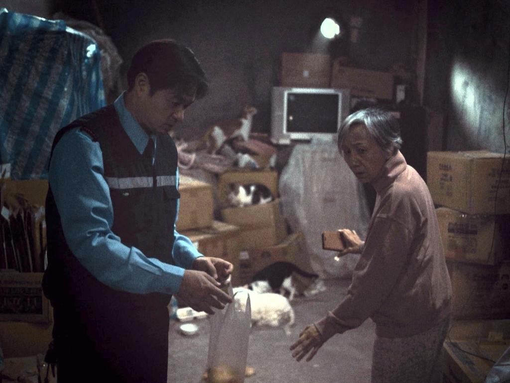 ▲ 陸弈靜飾演中文系退休教授劉惠與鄭有傑飾演的大樓管理員王國文,透過「貓」這個元素連結了兩個人關係。(圖:公視)