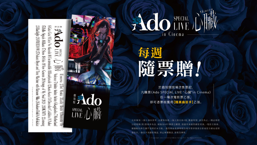 22歲的「日本最神祕爆紅歌姬」Ado,自2020年以〈煩死了〉一曲出道,在YouTube上僅用148天即突破一億次觀看,迅速成為J-POP新世代代表。她首度登上日本國立競技場舉辦的萬人演唱會,將以演唱會電影形式登上大銀幕──《Ado SPECIAL LIVE “心臟” in Cinema》是一部專為戲院打造、擁有全新混音與聲光升級的沉浸式電影,讓觀眾在電影院中重現現場感動。台灣更搶先日本,將於4月18日搶先上映!