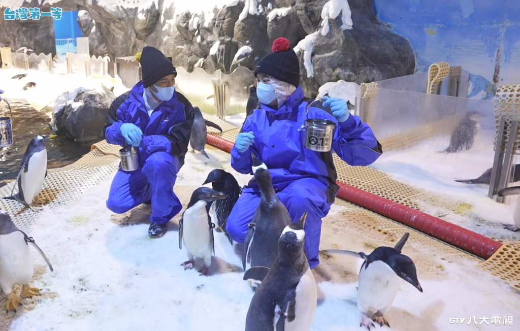▲ 竇智孔(左)和Junior(右)體驗飼育企鵝。(圖:八大)