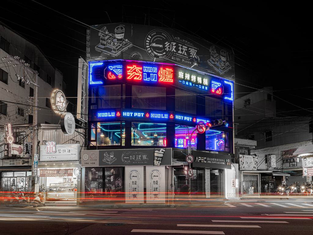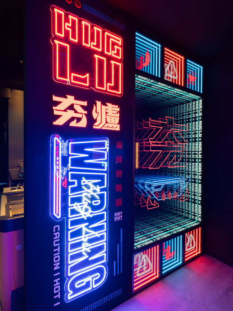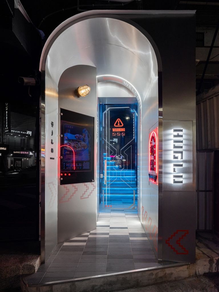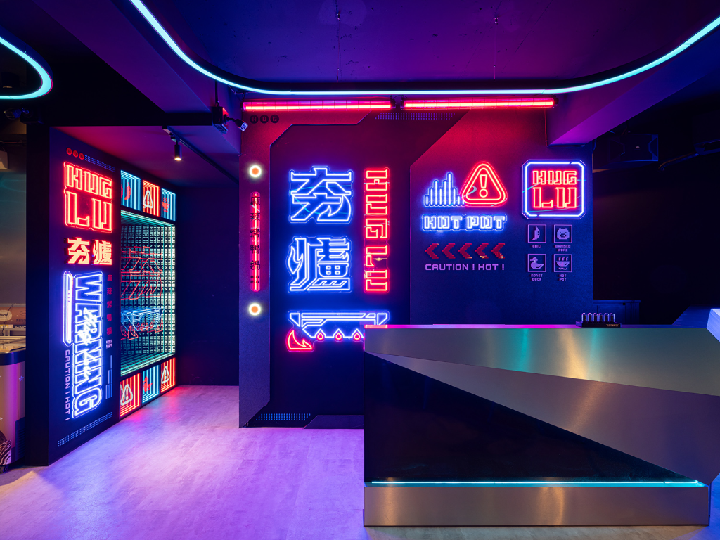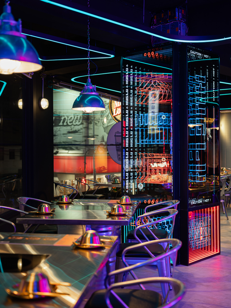 此案位於人流動率高的市區十字路口上,擁有交通便捷優勢,整體風格以夜晚與高吸睛度成為首要風格,設計師以賽博龐克為靈感主軸塑造空間形象,經典的霓虹燈管形塑出有趣的LOGO和幾何圖形,搭配線型燈光以及鏡面、金屬質感餐桌椅,猶如進入未來感的科幻世界。