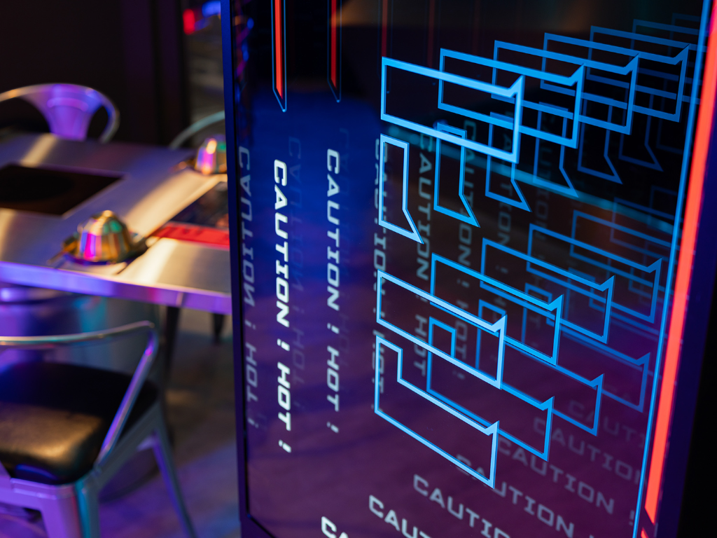 接待櫃台以金屬材質做出斜切造型,俐落中帶出潮流感,天花板以霓虹燈勾勒出區域界線,讓客人可循線了解餐廳動線,且全室具有反射特性的材質多為銀色,與品牌使用金色餐具可以做出強烈對比。空間設計以未來感與高彩度的視覺張力點亮空間,大量銀色金屬、霓虹燈與鏡面材質;反射鏡像豐富空間的視覺效果,為整體空間注入前衛與神秘氛圍。而材質本身也具易清潔的特性,可以完美適應高油汙的用餐環境。