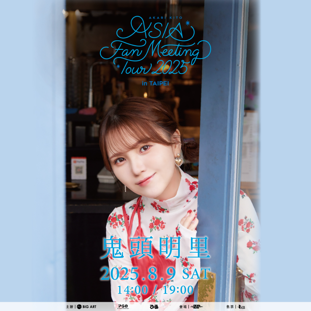 鬼頭明里「AKARI KITO ASIA FAN MEETING TOUR 2025 in TAIPEI」將於8月9日(六)於Zepp New Taipei舉辦,分午晚兩場,門票將採實名抽選制,5月12日(一)~14日(三)開放登記抽選,5月16日(五)中午公開抽選結果。後續將有數次的復活抽選,若結束後仍有票券,則統一於5月28日(三)中午12點於Ticket