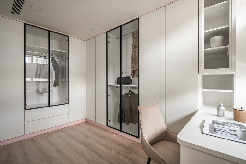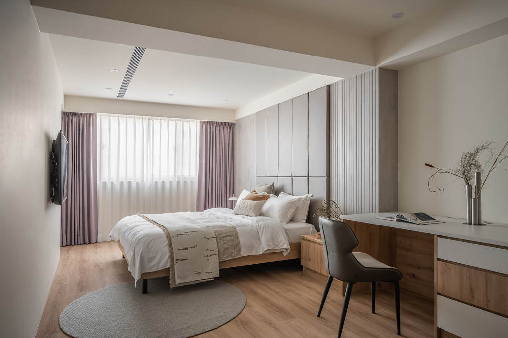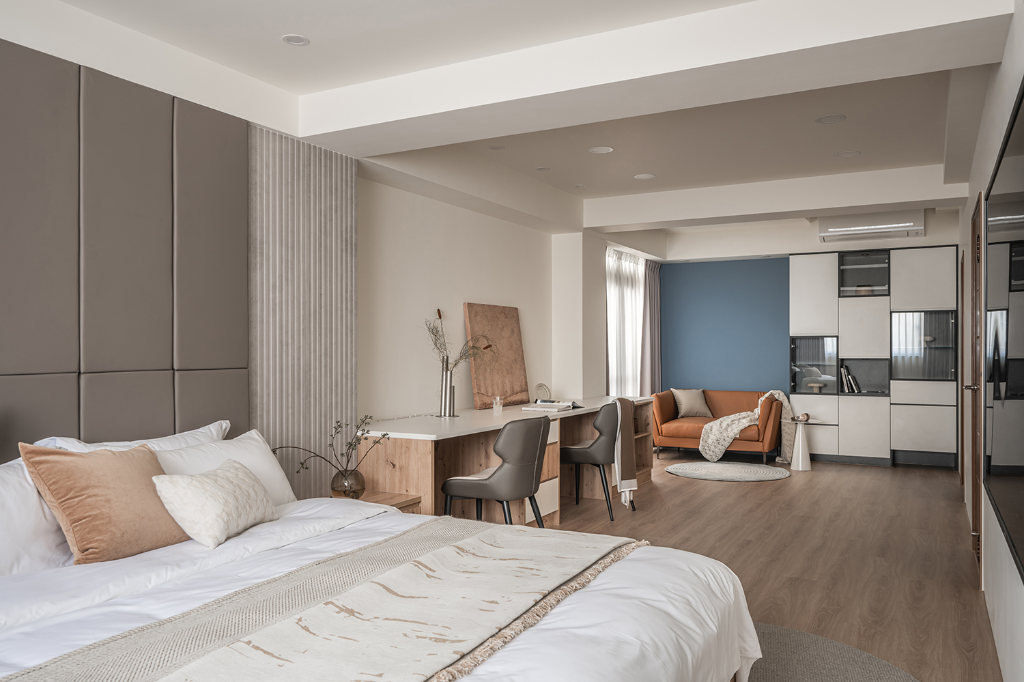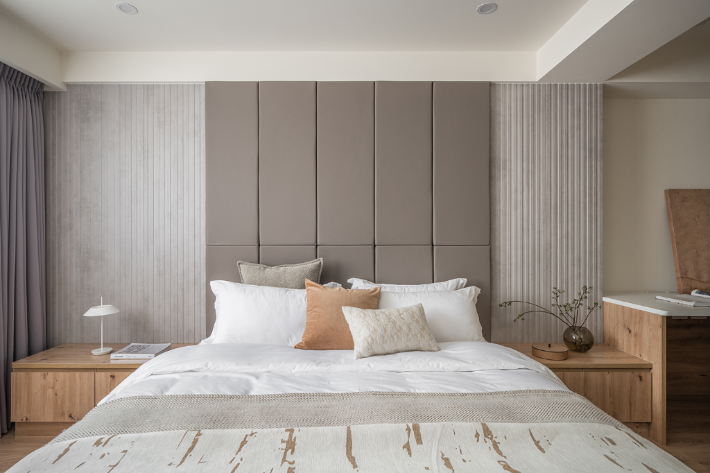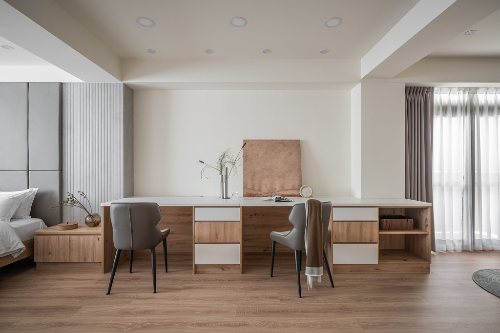 二樓主臥室則完美演繹多功能整合的空間美學。規劃一座深80公分、長約230公分的雙人書桌,讓夫妻能夠共享居家辦公的舒適體驗。毗鄰的閱讀角落與書櫃彼此輝映,在工作與休閒之間取得理想平衡。更衣室由輕巧的電視牆界定範圍,衣櫃局部使用玻璃門片,令量體倍顯輕盈通透。床頭牆以灰褐色繃布與系統波浪板材相串聯,輔以溫潤的木質床邊櫃,編織出一室靜謐舒適。