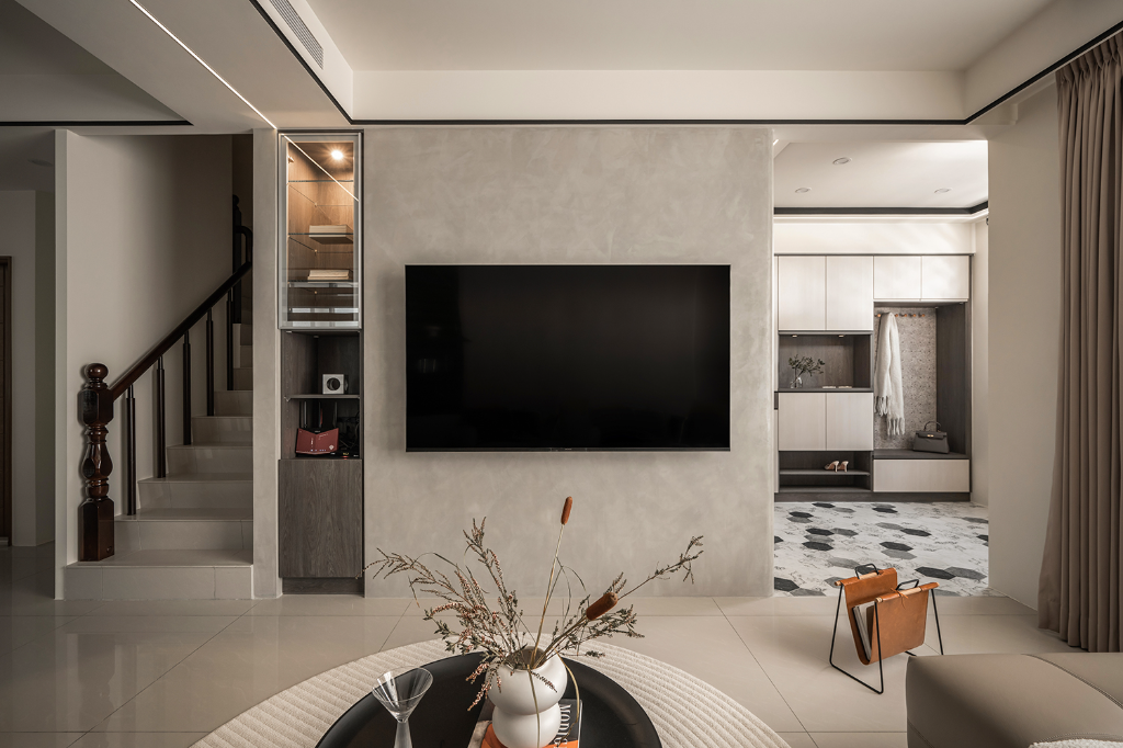 室內以內斂優雅黑白灰與大地色系為主調,特意挑選木節與石紋的自然肌理系統家具;以司曼特塗料營造精緻的電視牆。而沙發背牆採用的米諾斯石灰白壁板,不僅完美遮掩電箱,更以其低調內斂的姿態,為整體環境注入沉穩大氣的氛圍。同時考量到家中有年幼孩童,於是摒棄易受損的壁紙與木作裝飾,避免刺鼻異味影響健康。