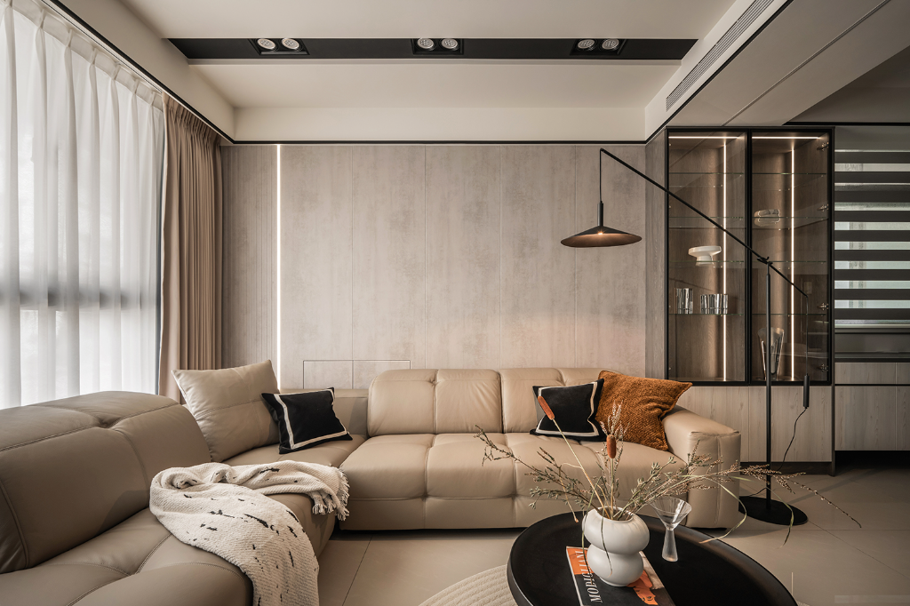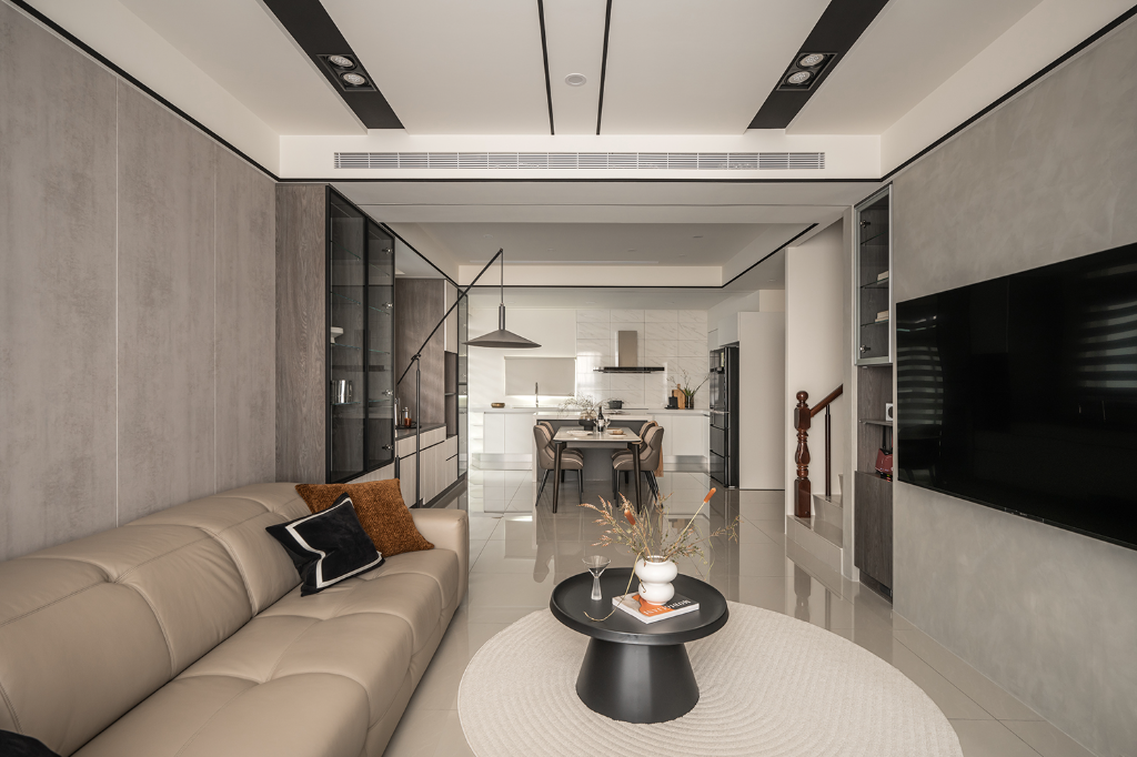 動線規劃上,細心考量樓梯位置、空調系統配置以及風水要素,將所有空間效能發揮極致。廊道尺度更遵循風水師建議,完美符合文公尺的吉利標準。在照明設計方面,公領域捨棄主燈,改以可調節角度的盒燈搭配LED線燈層層堆疊,營造媲美精品飯店的優雅氣息。並於天花採用框字形收邊,除了巧妙隱藏空調設備與管線,更為住家增添簡約俐落的視覺層次。
