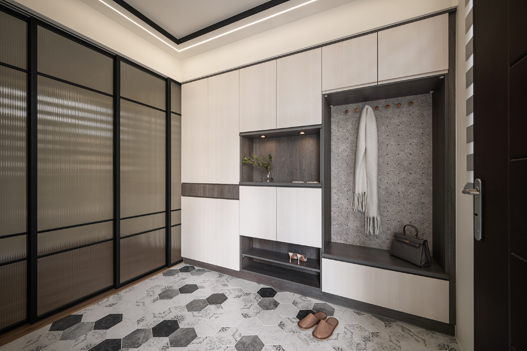 甫由大門進入,二進式玄關以時尚花磚鋪陳,形塑雅致落塵區。整合外出衣櫃、鞋櫃、穿鞋椅等日常必需品收納空間,不僅有效阻隔外界塵囂,更讓生活物件各得其所。玄關盡頭,一扇長虹玻璃悄然分隔出靜謐的佛堂場域,為繁忙的都市生活留下一方心靈淨土。