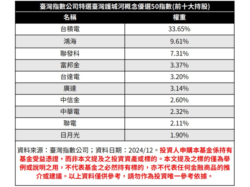 臺灣護城河概念優選50指數,指數以臺灣證券交易所上市普通股為母體,經流動性、產業、市值..等篩選,最終選取50檔作為成分股。而指數特別的是結合產業護城河及企業護城河指標,產業護城河指標是篩選近20季產業毛利率中位數屬前80%高的產業;企業護城河指標是考量經營規模、市值指標,以及投入資本報酬率(ROIC)與加權平均成本(WACC)之差等,簡而言之就是找到趨勢向上的產業,再從中聚焦有競爭優勢的公司。