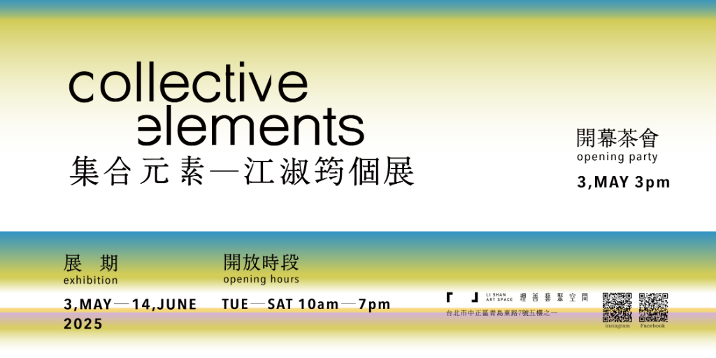 藝術家江淑筠2025年最新創作個展《collective elements — Chiang Shu-Yun Solo Exhibition|集合元素—江淑筠個展》,將於理善藝聚空間隆重登場。