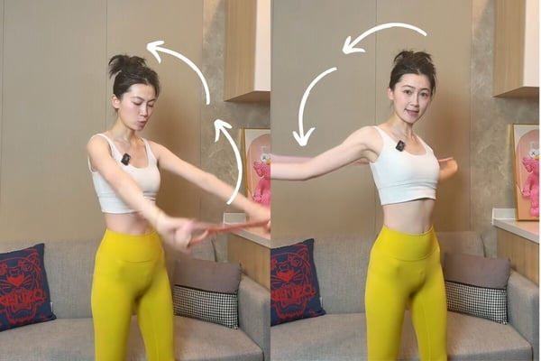 第一個動作先做直臂環繞來啟動肩關節,如果你有圓肩、富貴包,或者你的臉部輪廓不夠緊緻,甚至經常感到肩頸痠痛不舒服的話,那麼這個動作將會是你的救星,圓肩駝背將會遠離你。