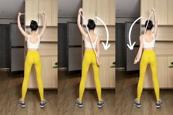 若力量不夠,要拉到後背感覺非常吃力的話,也可以改成簡單的手臂上抬,抬到耳朵的位置即可,以更柔和的方式來讓背部肌肉熱起來,也能避免拉傷。等感受到自己的背越來越有力之後,再環繞到後背去。