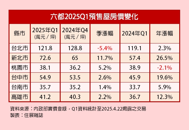 根據實價登錄資料統計,今(2025)年Q1六都的預售屋均價,只有台北市較上一季出現下跌,但跌幅不大僅5.4%。漲幅最大的是新北市,上漲逾一成;若與去年同期相比,則年漲26.5%依然奪下六都漲幅之冠。對比桃園市較去年同期微跌2.1%,是唯一呈現年跌趨勢的都會。