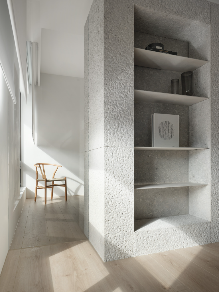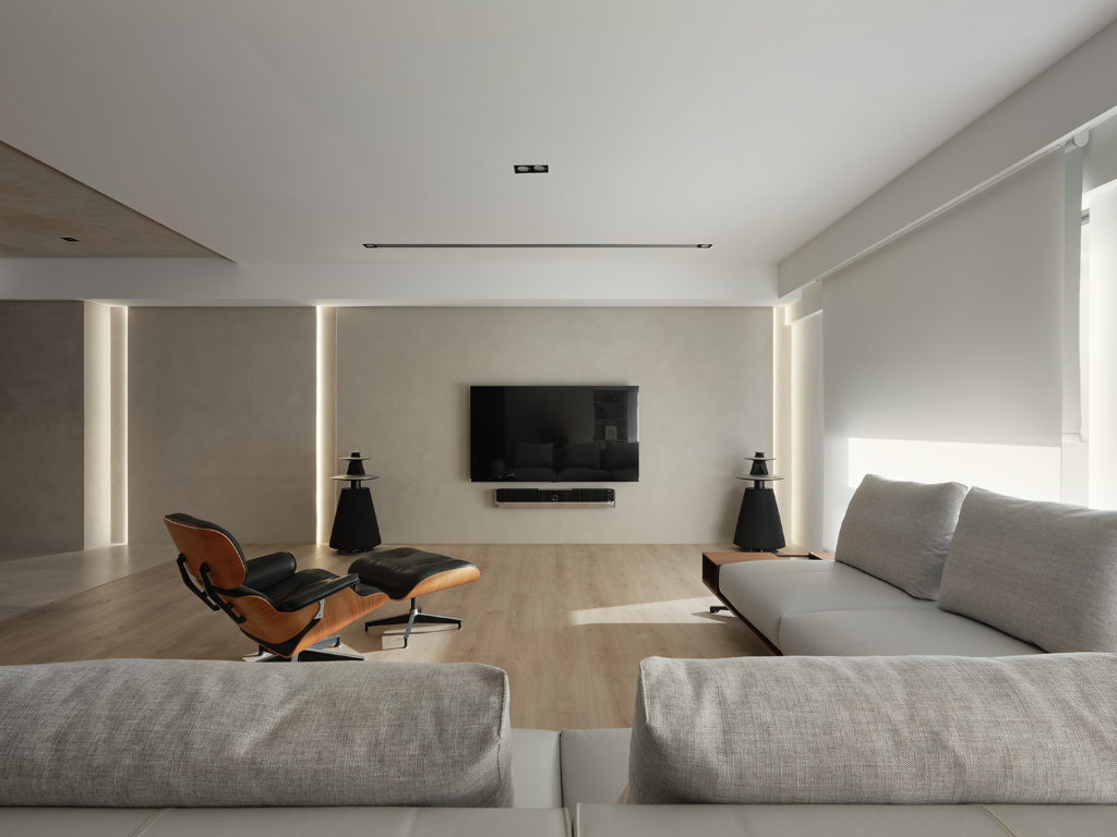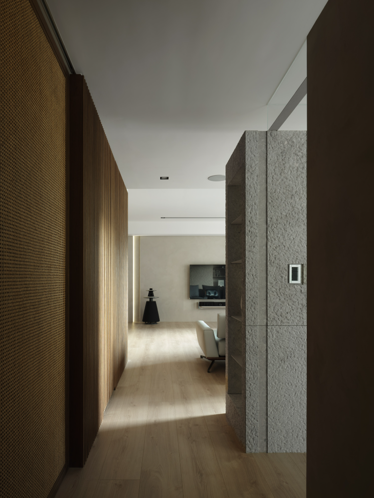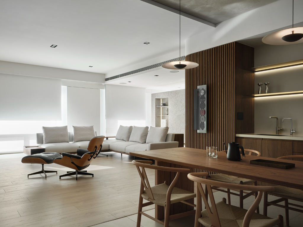 客廳的電視牆與餐廳天花採用特殊塗料處理,電視牆融入精巧的凹槽與條燈設計,通過光影變化與細膩紋理營造出視覺層次感。主牆旁擺放的絕版B&O beolab5音響與Eames Lounge Chair完美詮釋屋主內斂優雅的生活態度。書房與客廳之間運用手工鑿制的大理石配合透明玻璃,既保持空間區隔又維持視覺穿透性,石牆的粗獷表面與光滑內裡在燈光映照下展現獨一無二的強烈對比美。