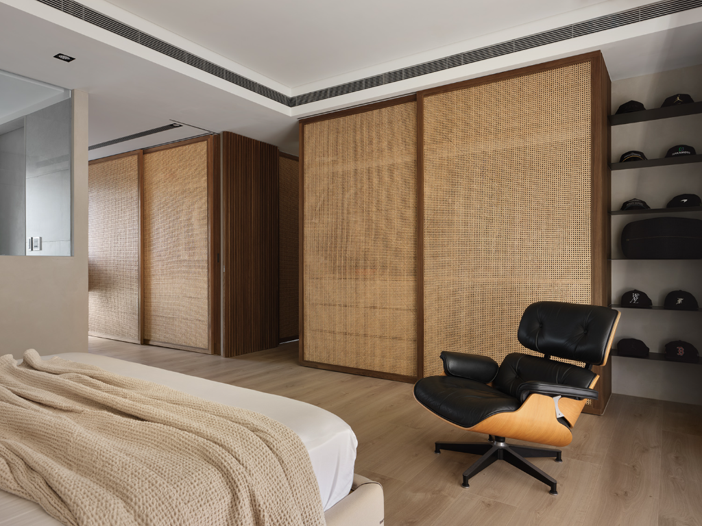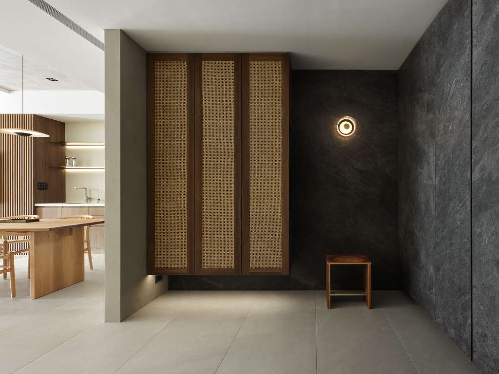 屋主是一對年輕的成功企業家夫婦,兩人對於日式侘寂風格情有獨鍾,設計團隊以此為靈感,運用素雅色調描繪空間基調,營造清新脫俗的無印氛圍。玄關區域保持簡約通透,僅在角落精心擺放伊東豊雄的Ripples Stool木椅,搭配丹麥設計師Sofie Refer的Blossi壁燈,再以藤編鞋櫃門片點綴,將侘寂美學詮釋得恰如其分。