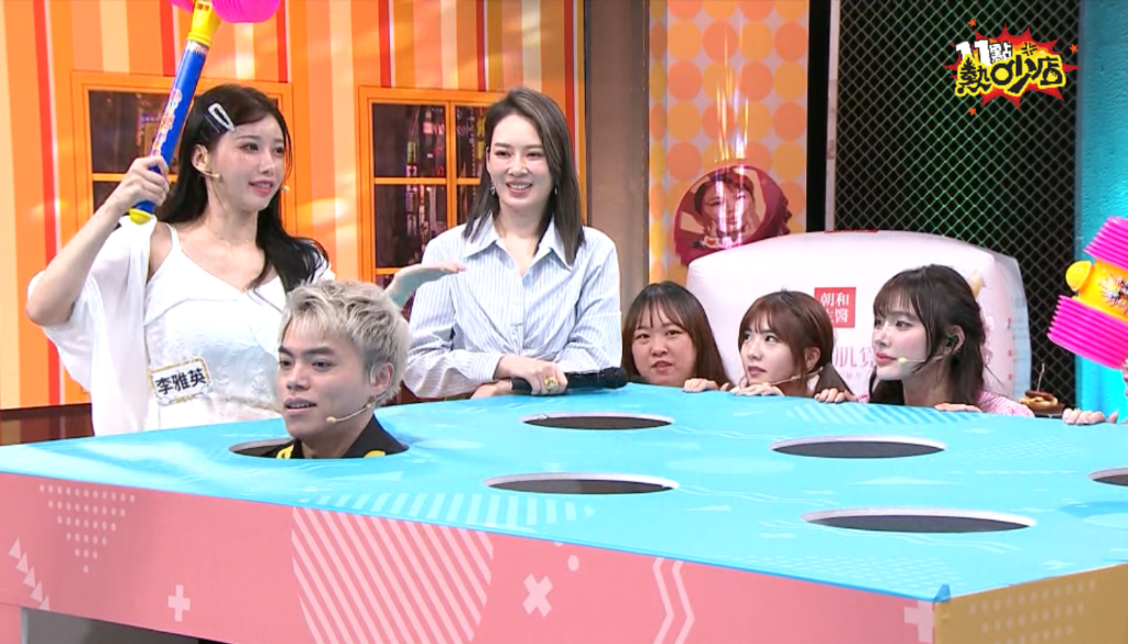 ▲ 李雅英(左)在攝影棚內玩人體打地鼠。(圖:TVBS)