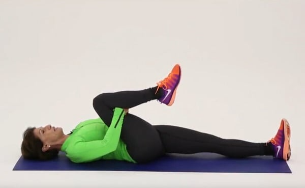 動作很簡單,躺著就能完成!躺平、頭擺正之後,雙腳伸直、雙手放在腹部,接著慢慢舉起其中一隻腳,屈膝向胸口的方向靠,雙手改放在膝蓋後側做固定,幫助延展整個僵硬緊繃的臀部肌肉、釋放腰的壓力。