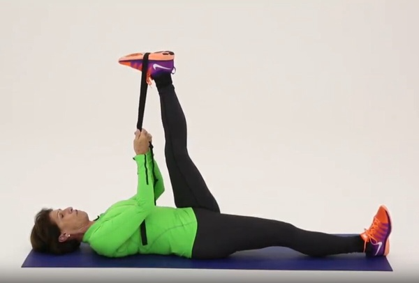 尤其初學者,建議拿瑜珈繩做輔助,姿勢才能更確實!躺下後,先將其中一隻腳屈膝抬起,接著將瑜珈繩繞過腳底固定在腳板中間,並慢慢地向天花板伸直,注意,只需要伸展到可伸展的極限就好、膝蓋有一點點彎曲也無妨,透過每次的練習,腳會越來越能伸直喔~