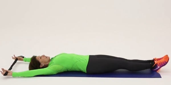 搭配瑜珈繩,伸展更有感!雙手寬度約與肩同寬,並用瑜珈繩做輔助,躺下後,頭擺正、慢慢將雙手上抬到頭頂,雙腳也伸直、腳尖朝前,幫助身體整個被伸展開來,讓因姿勢不良或因長期坐著/站著而造成的壓迫與痠痛都被舒展開來,得到放鬆。