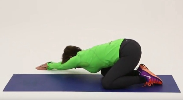 接著好好放鬆整個下半身!想要拉開下背部、腰甚至是臀部肌肉,瑜珈當中的嬰兒式是非常好的體位,而哈佛醫學院提出的教學是多個方位的版本。第一個方向是面對正前方先四足跪姿,雙手與肩同寬、雙腳與髖骨同寬,接著臀部慢慢往後、盡可能坐到腳跟上(坐不到也沒關係喔),以延展整個後半部;接著分別往左前方與右前方雙手交疊延展,最後再回到正前方,讓整個身體後半部全方面的被伸展放鬆到。