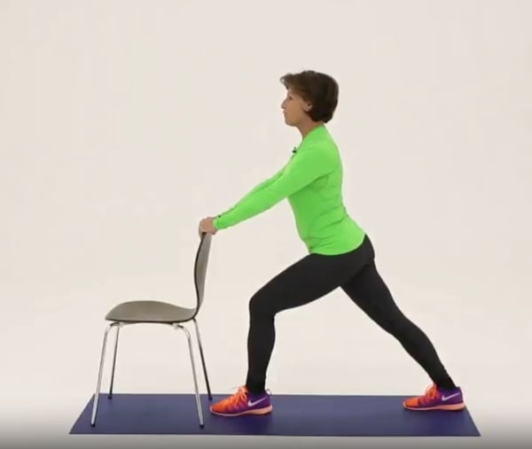 最後來個弓箭步!用不會滑動的椅子當輔助,確保安全的同時也可讓動作完成的更確實,雙手輕鬆放在椅背上,接著左右腳輪流做出弓箭步的動作,記得保持抬頭挺胸、收肚子、核心出力,並可視個人情況決定步伐的大小,原則上只要膝蓋不過度彎曲到超過腳尖,都在可接受範圍。
