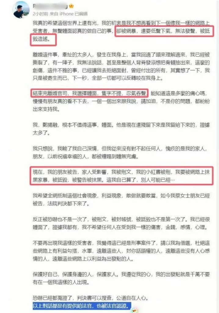 鄭揚融以此視為Mandy出軌證據,並補充了來自物業管理員的聊天記錄以及鄰居的錄音證詞,進一步指控馬筱梅婚內行為不端,「叫床聲」大到鄰居都聽見。此外,更公開了雙方對話截圖,女方在面對質疑時情緒激動,且未正面否認。