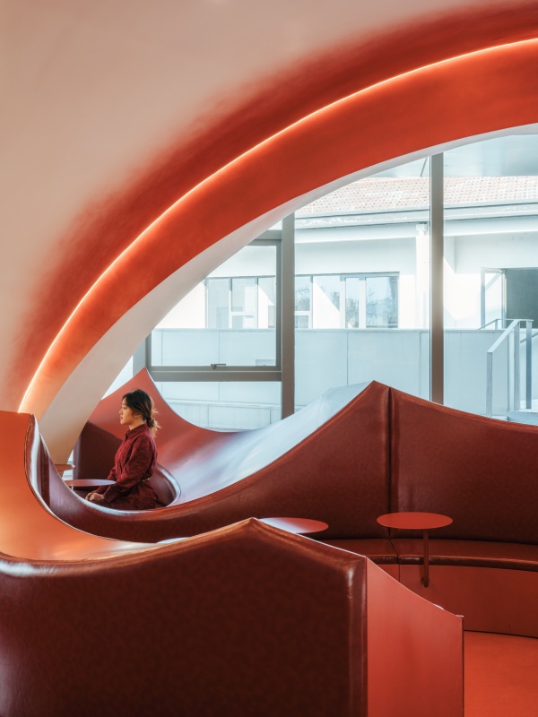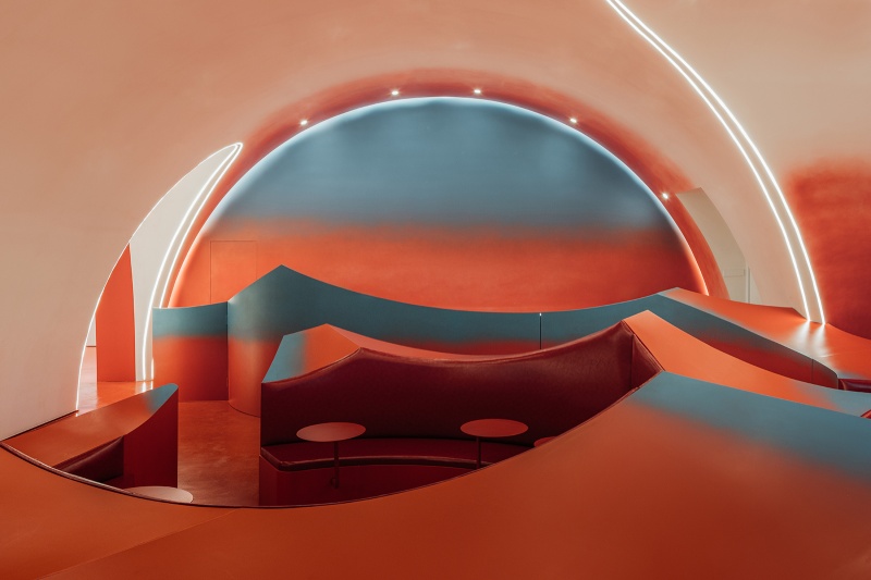 第二層空間體現「窯燒」的炙熱氛圍,暗喻思想歷經挑戰與提煉的過程。空間中的座椅和書架,是選用紅漸變藍的色彩做呈現。再搭配洞穴式的空間設計,便能使人仿若置身在高溫炙烤的窯爐內,帶來強烈的感官衝擊。該樓層功能主要為咖啡館和文創展區。人們能在此閱讀書籍、感受陶藝文化的氣息,抑或是靜下心來思考人生、品味咖啡香,享受知識與火燄共舞的空間張力。移動至戶外,沿著紅色鋼梯拾級而上,便可抵達懸挑5米的紫台,並遠眺UCCA