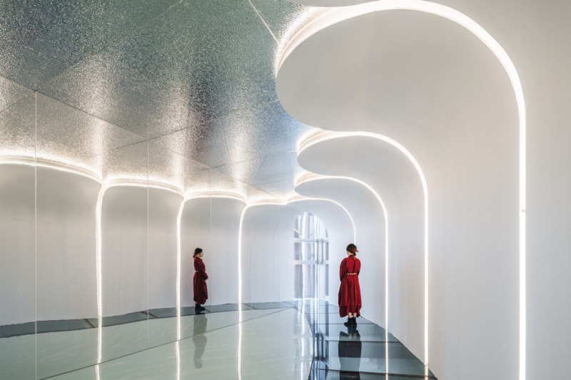 第三層空間,來到最後「成器」的階段。地坪是採用水波紋漆鋪設而成,宛若水面般蕩漾著波光,天花板結構則以層層漣漪型態做回應。藉此,整個場域將猶如一只盛滿清水的紫砂壺,承載著知識的積澱與智慧的昇華。而「水」的意象也創造了空間的澄澈之感。其中,天花板輕盈的光幕設計,層層的光波就如同思想的波紋,最終匯聚成智慧的水流,從天而降灌入壺中,講述著知識的積累與內化。